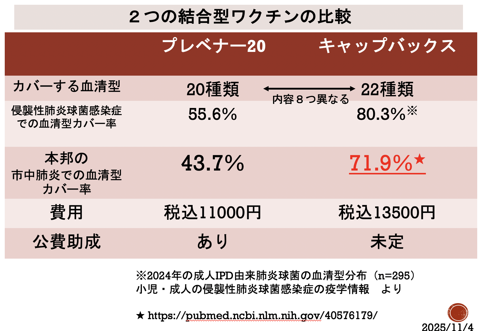 最新だけあって疫学を元にカバーする血清型をセレクトしているので22個の血清型というプレベナーより2種しか増えていないように見えて実際には8つの血清型がプレベナーと異なります。侵襲性肺炎球菌感染症(致命的な感染)や市中肺炎、どちらのシチュエーションにおいてもプレベナーよりもカバー率が高くワクチンの効果が高いと考えられます。それに伴い値段も上がってしまいましたが魅力的な内容となっています。プレベナーが小児にも適応が通っていることに対してキャップバックスは小児には通っていないため当院では希望者の予約を確認してからお取り寄せして届いてからの接種、という形になります。